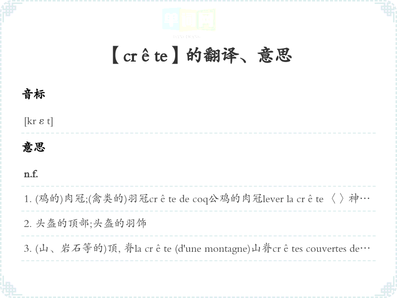 (鸡的)肉冠;(禽类的)羽冠crête de coq公鸡的肉冠lever la crête 〈〉神气活现;勇气十足baisser la crête 〈〉垂头丧气rabaisser la crête à qn〈〉掉某人的骄气
