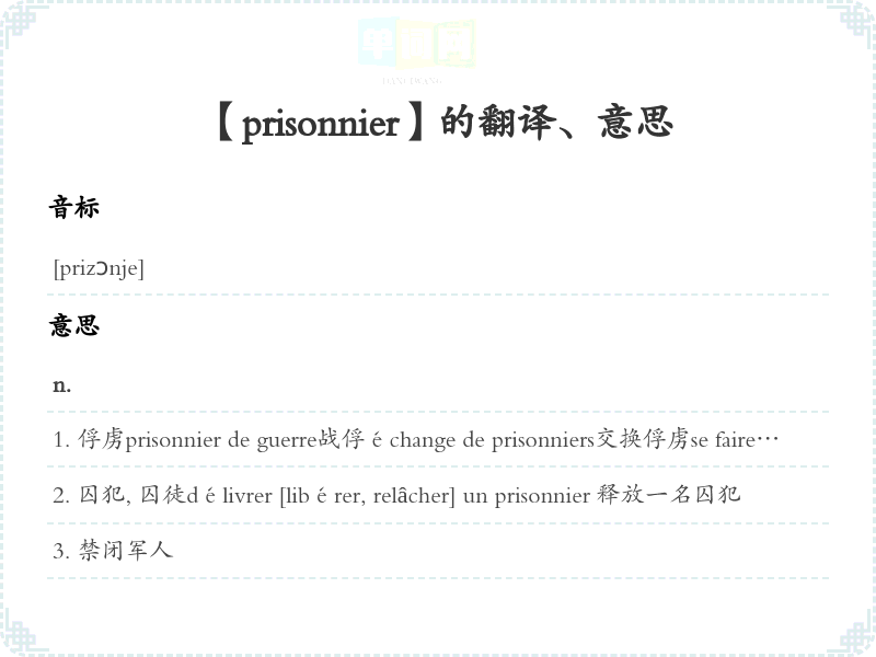 俘prisonnier de〈转义〉…奴隶, …俘虏;受…束être prisonnier de ses préjugés偏见束