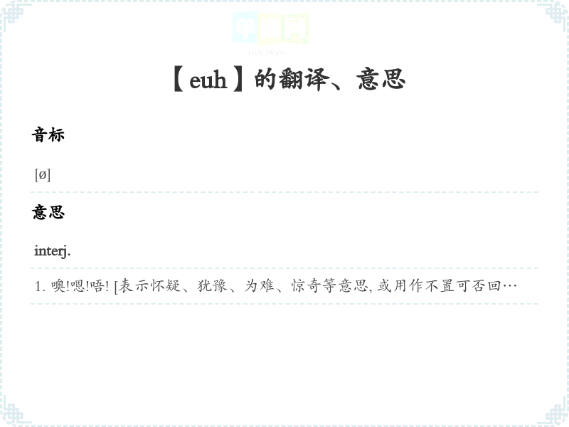 噢!嗯!唔! [表示怀疑、犹豫、为难、惊奇等意思, 或用作不置可否回答]C'est comme je vous le dis!— — Euh! vous êtes sûr? 我跟您讲是事实! — —噢!您能肯定吗?Alors, cela vous plaît?— — Euh! euh! !... 那么, 这个中您意吗? — —嗯!嗯!…