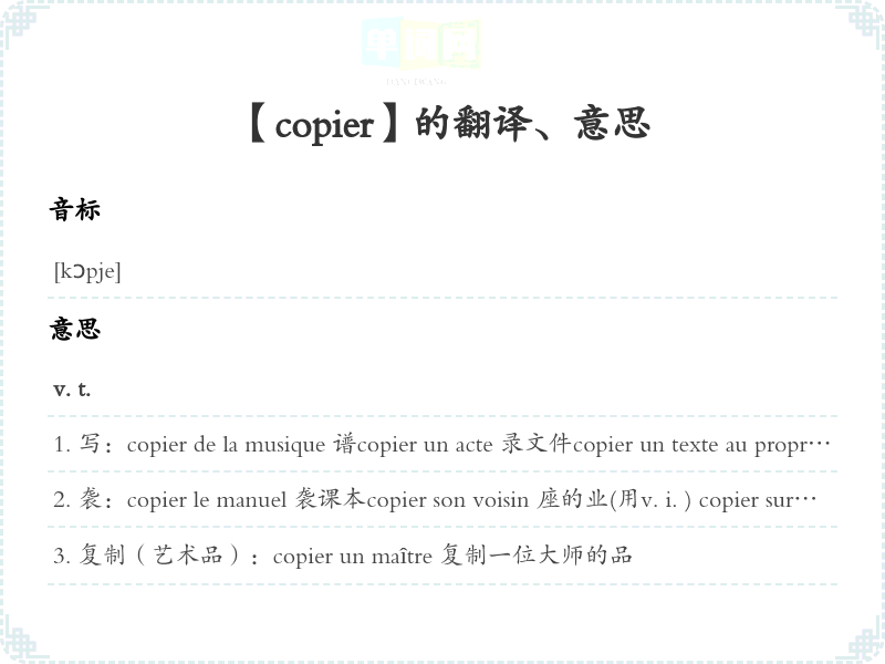 写:copier de la musique 谱copier un acte 录文件copier un texte au propre (au net) 誊清文章