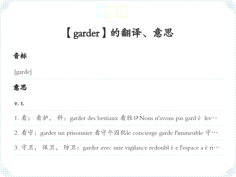 看; 看护, 料:garder des bestiaux 看牲口Nous n'avons pas gardé les cochons ensemble. [转, 俗]咱们熟朋友。 [用来责备对方对自己太随便, 太讲礼貌]garder des enfants 孩子garder à vue 看牢, 严密看