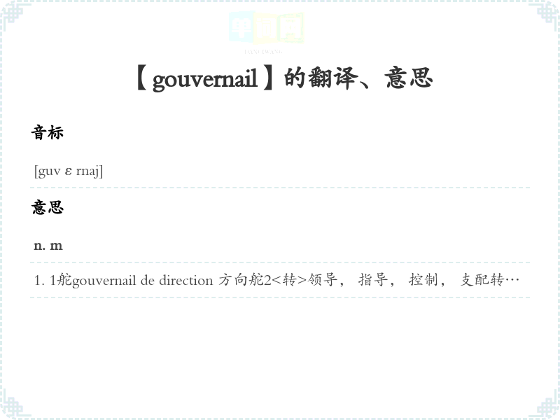 1舵gouvernail de direction 方向舵2<转>领导, 指导, 控制, 支配转>être au gouvernail 处于领导地位