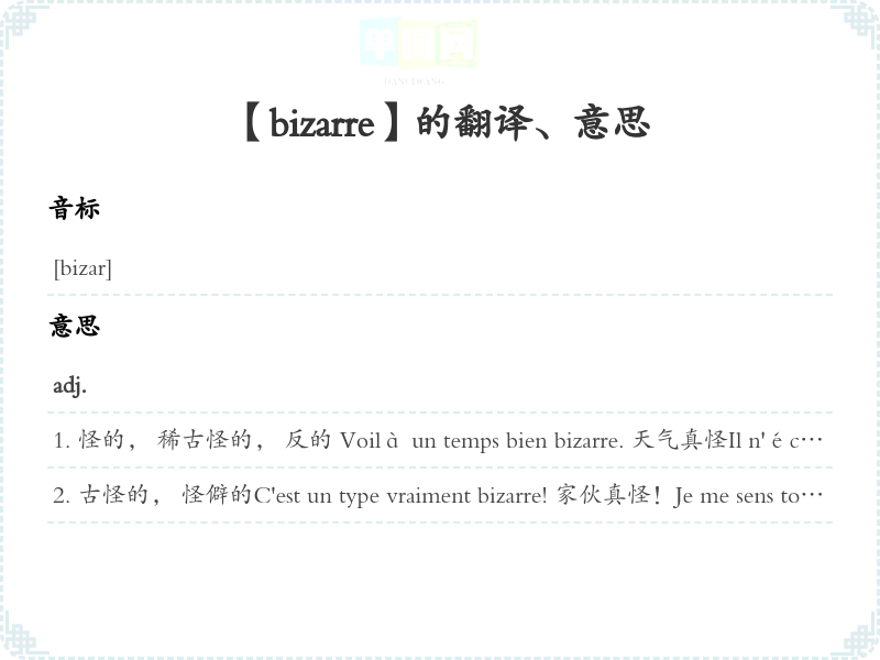 古怪的, 怪僻的C'est un type vraiment bizarre! 家伙真怪!Je me sens tout bizarre. 我觉得浑身不。n. m.怪