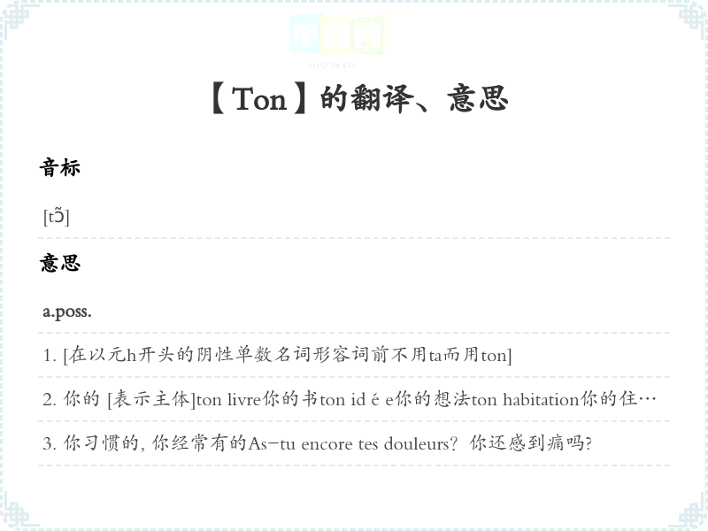 你的 [表示主体]ton livre你的书ton idée你的想法ton habitation你的住所ta pomme〈行话〉你tes parents你的父母Ferme donc ta porte.把你(房间)的门关上。