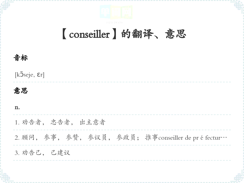 顾问, 参事, 参赞, 参议员, 参政员; 推事conseiller de préfecture 州议员,省议员conseiller municipal 市参政员,市参议员conseiller à la cour d'appel 上诉法院推事conseiller commercial/ culturel 商务/文化参赞n. f.参事夫, 参赞夫, 参议员夫v. t.劝告, 建议, 出主意:Je vous conseille le sang-froid. 我劝你要沉着。 conseiller à qn de faire qch 劝做事:Je vous conseille de ne plus fumer. 我劝你不要再抽烟了。 conseiller qn 出主意:conseiller un enfant dans ses études 指导孩子的学习Vous avez été bien conseillé. 家你出了好主意。se conseiller v. pr.
