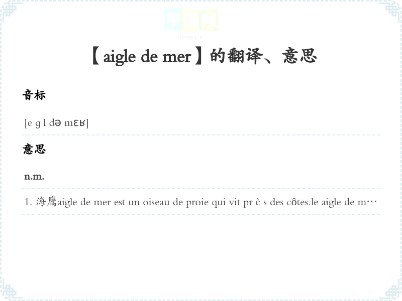 【aigle de mer】 助记:、 词根:、 联想、 名词化:、 词化:、 形容词化:、 近义词、 反义词、 同音、近音词 联想词