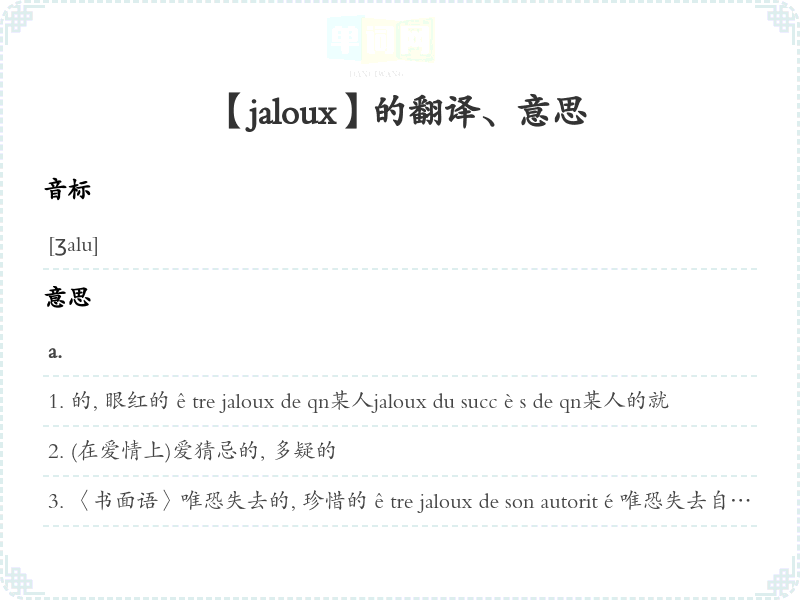 〈书面语〉唯恐失去的, 珍惜的être jaloux de son autorité唯恐失去自己的威信être jaloux de (+inf.)渴望, 巴不得avec un soin jaloux 小心翼翼地, 唯恐有失地— n.忌者faire des jaloux 引起, 引人眼红