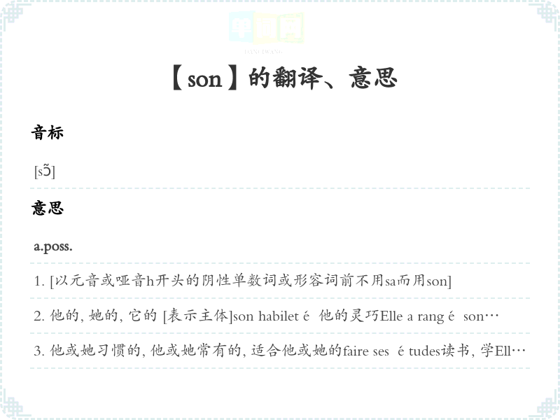 他的, 她的, 它的 [表示主体]son habileté 他的灵巧Elle a rangé son armoire. 她整理了她的衣橱。Il a ses lunettes sur son nez. 他鼻子架着。la machine et son rendement 器及其效率