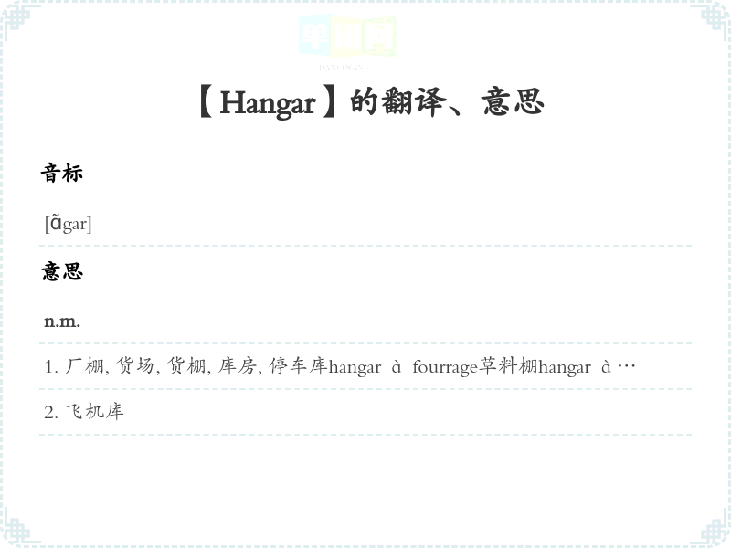 厂棚, 货场, 货棚, 库房, 停车库hangar à fourrage草料棚hangar à locomotives机车库