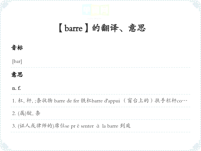 【barre】 词:、 联想、 近义词、 同音、近音词 联想词