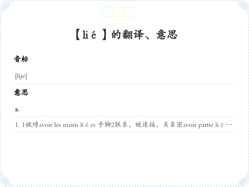1被缚avoir les mains liées 手脚2联系,被连接,关系密avoir partie liée avec qn 有某人休戚相关ils sont très liés. 他们关系十分密。3受4【烹饪】勾芡,黏稠