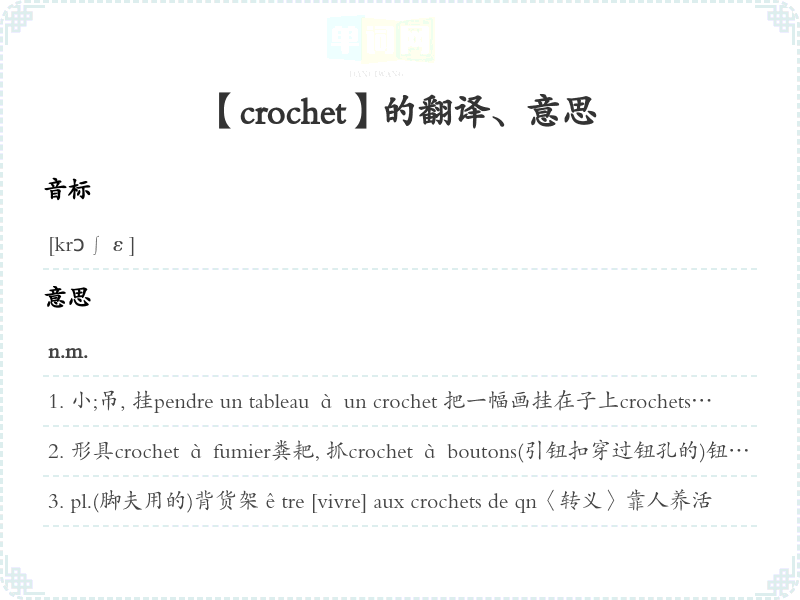 【crochet】 助记:、 词根:、 动词变化:、 名词变化:、 形容词变化:、 近义词:、 反义词: 联想词