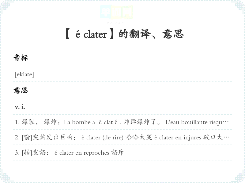 [喻]突然发出巨响:éclater (de rire) 哈哈大笑éclater en injures 破口大骂éclater en sanglots 嚎啕大哭Des applaudissements éclatèrent. 爆发出阵阵掌声。 La foudre éclate. 霹雳一声响。