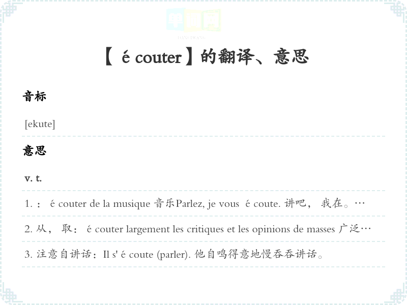 【écouter】 联想:、 名词变化:、 近义词:、 反义词: 联想词