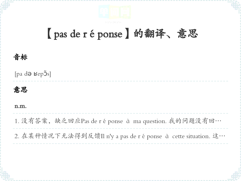 在某种情况下无法得到反馈Il n'y a pas de réponse à cette situation. 这种情况下没有答案。