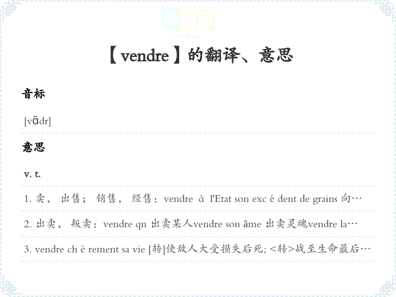 【vendre】 派生:、 用法:、 近词:、 词: 联想词
