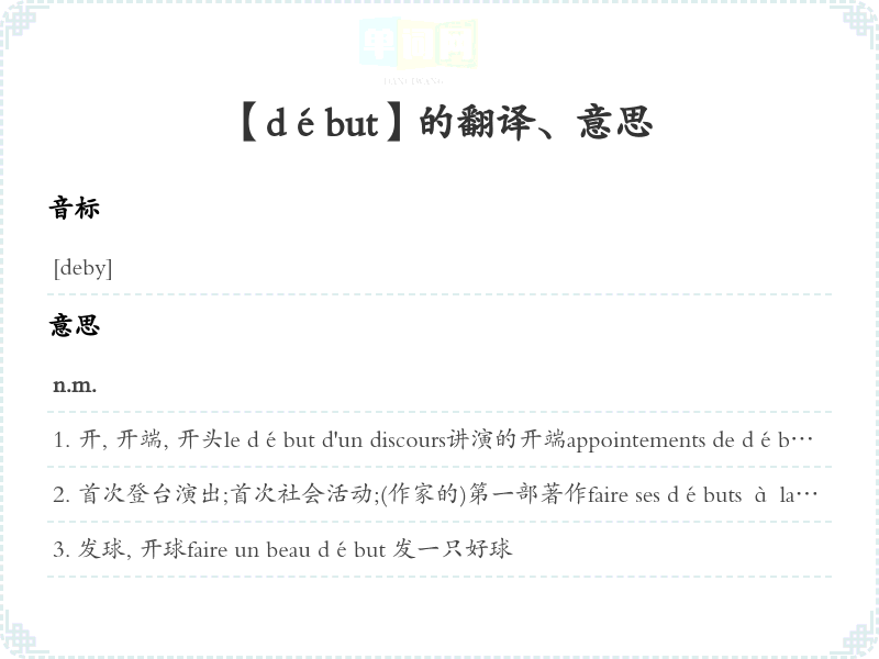 开, 开端, 开头le début d'un discours讲演的开端appointements de début 起初的工资le début de l'hiver初冬le début du mois月初du début à la fin从头到尾, 自tout au début , au tout début 初dès le début 一开头, 一开Reprenons le récit à son début .我们再从头讲起吧。