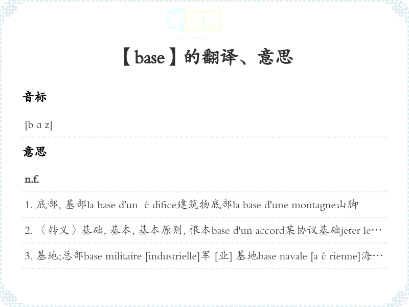 〈转义〉基础, 基本, 基本原则, 根本base d'un accord某协议基础jeter les bases de qch.奠定…基础sur la base de在…基础上à base de:以…原料: un cocktail à base de gin 以杜松子酒主调制鸡尾酒salaire de base 基薪, 底薪avoir de bonnes bases en mathématiques学基础扎实