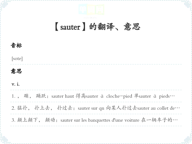 , 蹦, 踊跃:sauter haut 得高sauter à cloche-pied 单sauter à pieds joints 并, 立定:sauter à pieds joints par-dessus les difficultés []不顾困难去干sauter de joie 高兴得来sauter aux nues (au plafond) [俗]火冒丈; 大吃一惊sauter sur un cheval 上一匹马sauter à bas du lit 下床sauter en selle 跃上马鞍