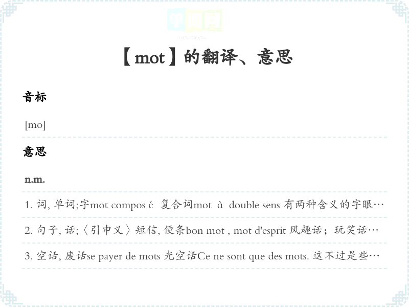词, 单词;字mot composé 复合词mot à double sens 有两种含义的字眼mot de plusieurs syllabes 多音节词un mot nouveau 新词un nouveau mot 生词groupe de mots 词组gros mot 粗字眼;脏话, 骂人话grands mots 夸大的字眼mot d'ordre 口令;口号mot de passe 口令le fin mot de l'affaire 底细, 内情le fin mot de l'histoire 故事的奥秘le mot de l'énigme 谜底le mot de cinq lettres 五个字母的那个单词 [指 merde]faire des mots croisés 做纵横填字游戏avoir un mot sur le bout de la langue 一个字眼到了嘴边 [指几乎想起, 一时不出来]Orgueilleux, ce n'est pas le mot. 骄傲吧, 这个词也不确切。chercher ses mots 寻找字眼compter ses mots 装模作样地慢吞吞地讲话jouer sur les mots 玩弄字眼manger ses mots 话口齿不清ne pas souffler mot 一言不发se donner le mot 事先商量,Il ne dit pas un mot. Il ne dit mot. 他一言不发。