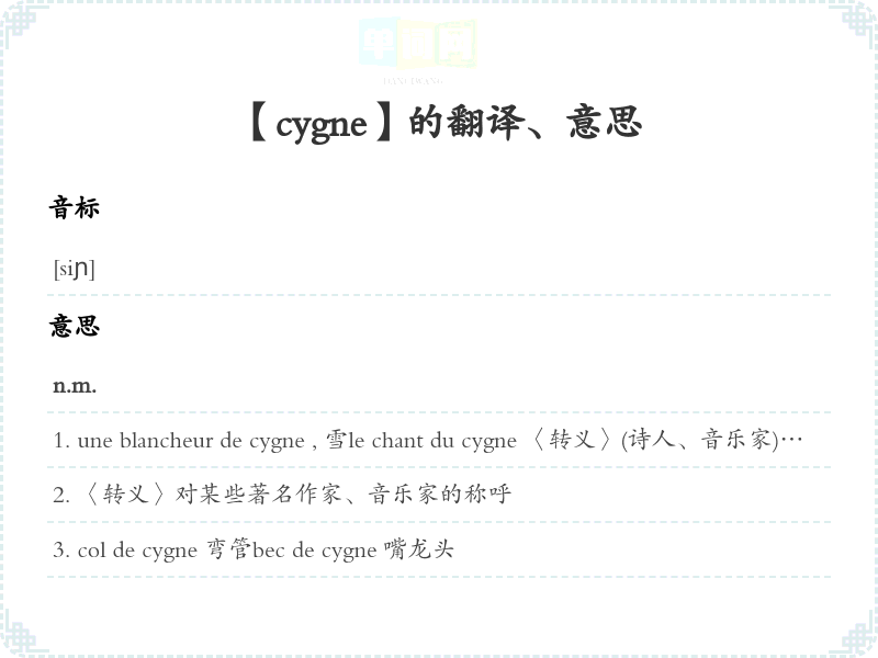 une blancheur de cygne , 雪le chant du cygne 〈转义〉(诗人、音乐家)最后的一部杰作, 绝唱