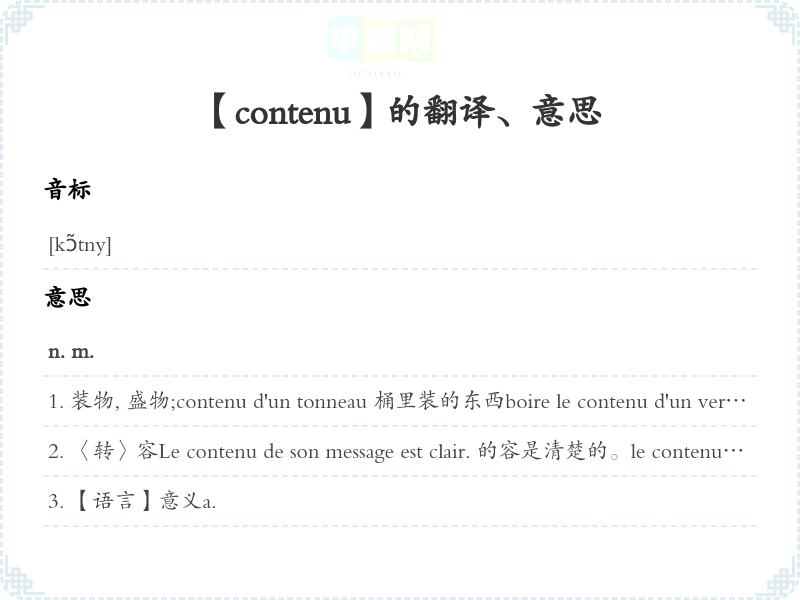 〈转〉容Le contenu de son message est clair. 的容是清楚的。le contenu d'une lettre 信的容l'unité du contenu et de la forme 容与形式的统一