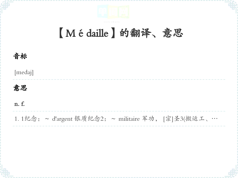 1纪念:~ d'argent 银质纪念2:~ militaire 军功, [宗]圣3(搬运工、流动摊贩等佩带的)号