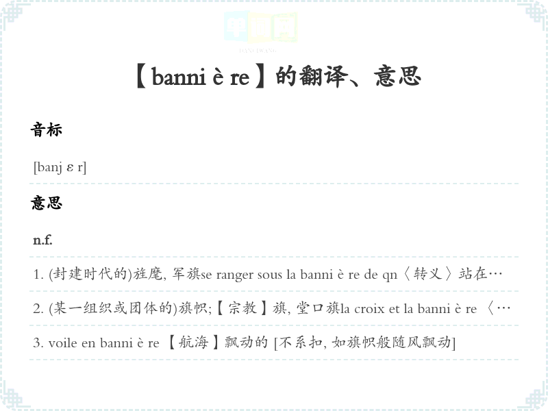 (某一组织或团体的)旗帜;【宗教】旗, 堂口旗la croix et la bannière 〈转义〉很多困难, 很多麻烦