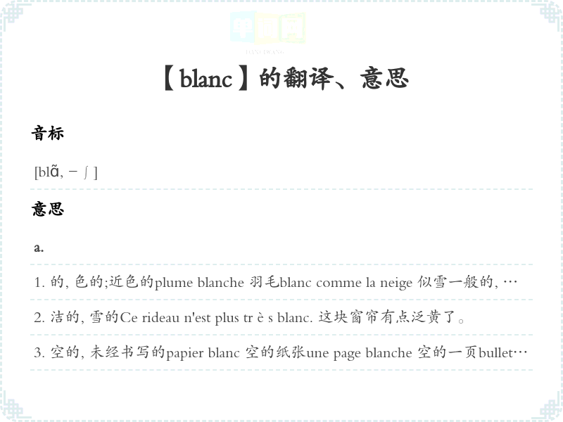 【blanc】 词根:、 派生:、 联想:、 动词变化:、 形容词变化:、 近词:、 反词: 联想词