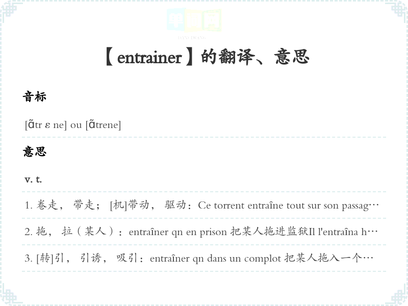 训练, 锻炼:entraîner une équipe de football 训练足球队entraîner qn à la natation 训练某人游泳entraîner des soldats 训练士兵nageur bien entraîné 训练有素的游泳者[宾语省略]担任教练s'entraîner v. pr.进行训练, 锻炼, 练习:Ils s'entraînent pour un match amical. 他们为参加一场友比赛进行练习。 s'entraîner au lancer de la grenade 练习投手榴弹s'entraîner à prendre la parole en public 锻炼在许多人面前讲话