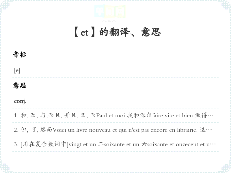 和, 及, 与;而且, 并且, 又, 而Paul et moi 我和保尔faire vite et bien 做得又快又好Deux et deux font quatre. 二加二等于四。Taisez-vous et écoutez. 别说了, 听。Il y a livres et livres. 有种种, 有好有坏。passer et les monts et les mers 越过高山大海Il parle français, et couramment. 他会讲法语, 而且讲得很流利。J'ai accepté. Et vous? 我接受了。您呢?