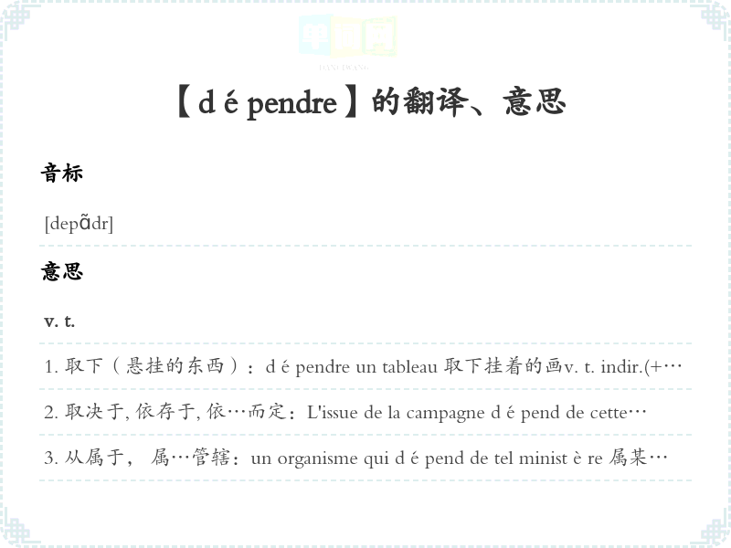 【dépendre】 助记:、 :、 用法:、 近义词:、 反义词: 联想词