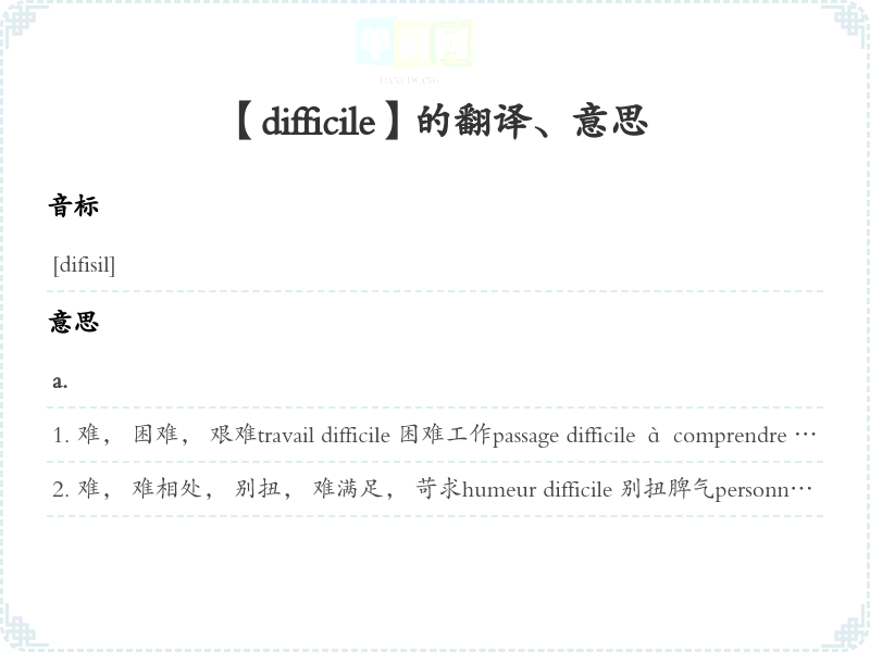 【difficile】 助记:、 派生:、 联想:、 副词变化:、 近义词:、 反义词: 联想词