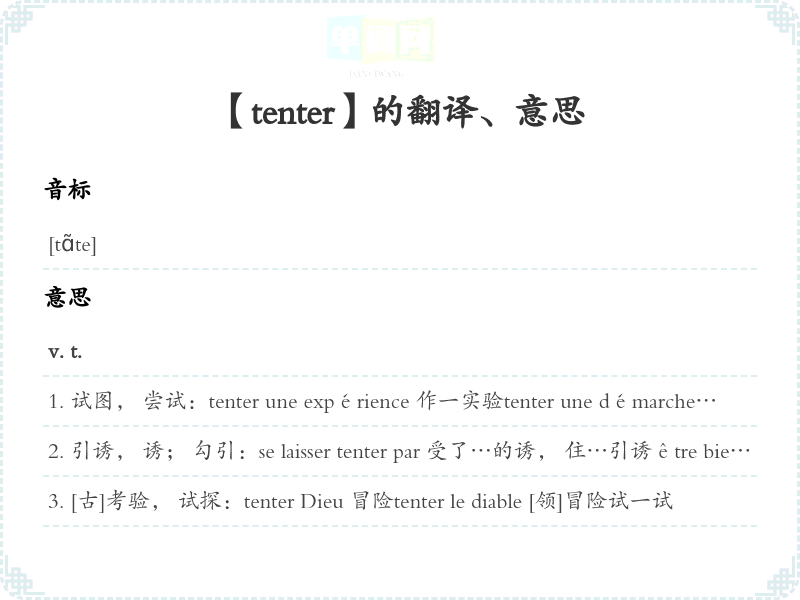 试图, 尝试:tenter une expérience 作一实验tenter une démarche auprès de qn 走某人的门路, 找某人帮忙tenter l'impossible 作根本办到的事Il a tout tenté pour réussir. 为了夺冠到目的, 他什么办法都试过了。 tenter le tout pour le tout 孤注一掷tenter sa chance (la fortune) 碰运气tenter de (+ inf. ) 试图, 企图, 力图:tenter de battre un record 企图打破记录