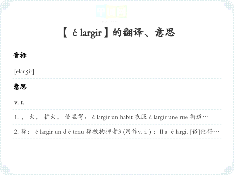 释:élargir un détenu 释被拘押者3 (用作v. i. ) :Il a élargi. [俗]他得魁梧了。s'élargir v. pr., 大:Le sentier s'élartissait. 小路了。