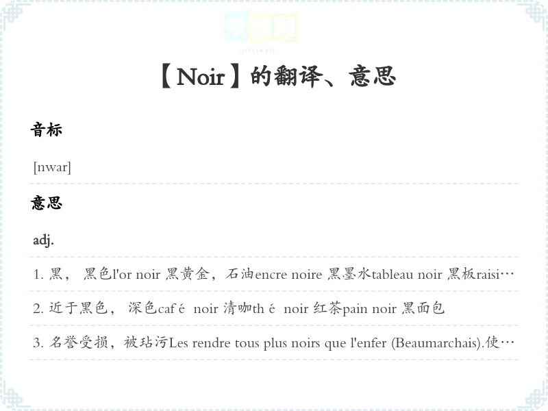 【Noir】 联想:、 名词变化:、 动词变化:、 形容词变化:、 副词变化:、 近义词:、 反义词: 联想词