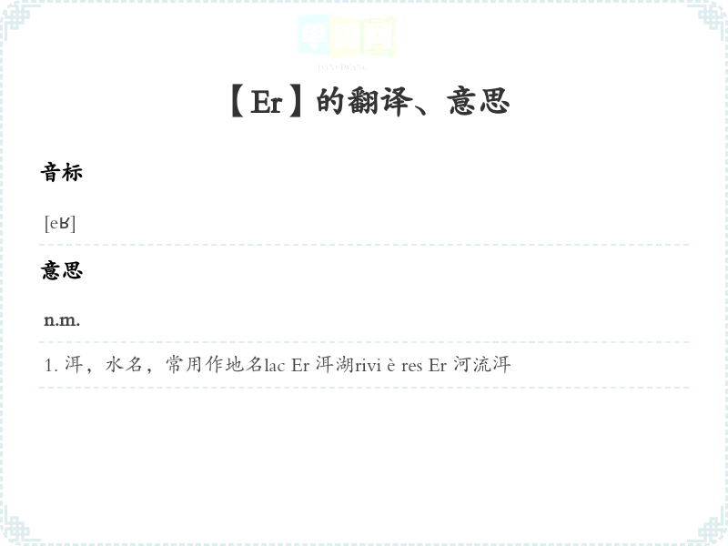 洱,水名,常用作地名lac Er 洱湖rivières Er 河流洱