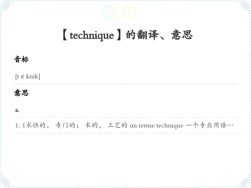 【technique】 助记:、 词根:、 派生:、 近义词: 联想词