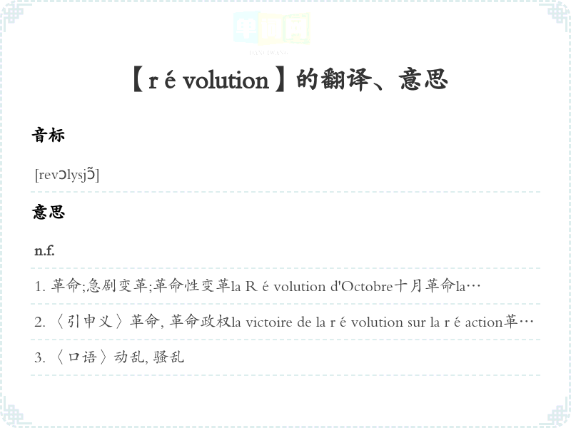 【révolution】 助记:、 词根:、 近义词:、 反义词: 联想词