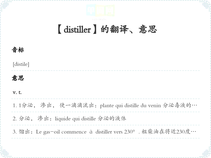 1分泌, 渗出, 使一滴滴流出:plante qui distille du venin 分泌毒液的植物2 [转]散发出, 散布:distiller l'ennui 令人厌倦3蒸馏:purifier de l'eau en la distillant 用蒸馏的办法来净化水distiller du bois 干溜木材4[书]酿出(液汁):L'abeille distille le miel. 蜜蜂酿蜜。5[转]使…精练:distiller ses pensées 使思想精练v. i.
