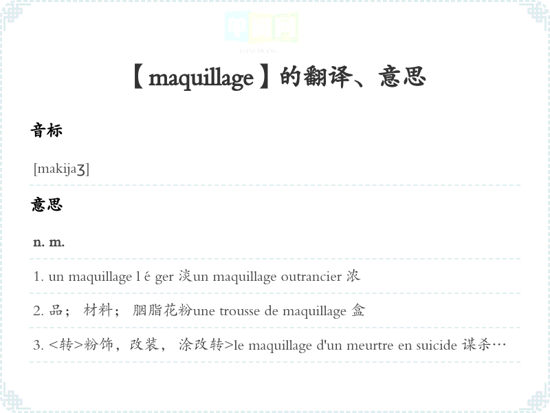 【maquillage】 联想:、 近义词:、 反义词: 联想词