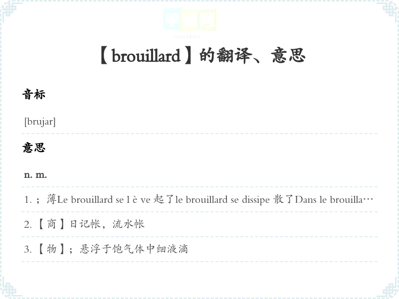 ;薄Le brouillard se lève 起了le brouillard se dissipe 散了Dans le brouillard 在中n'y voir que du brouillard 什么也搞不懂être dans le brouillard <转>如堕五里中转>