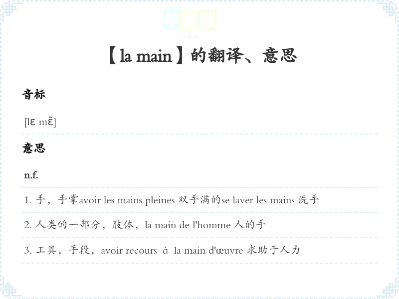 【la main】 助记:、 词根:、 联想、 名词化:、 词化:、 形容词化:、 近义词、 反义词、 同音、近音词 联想词
