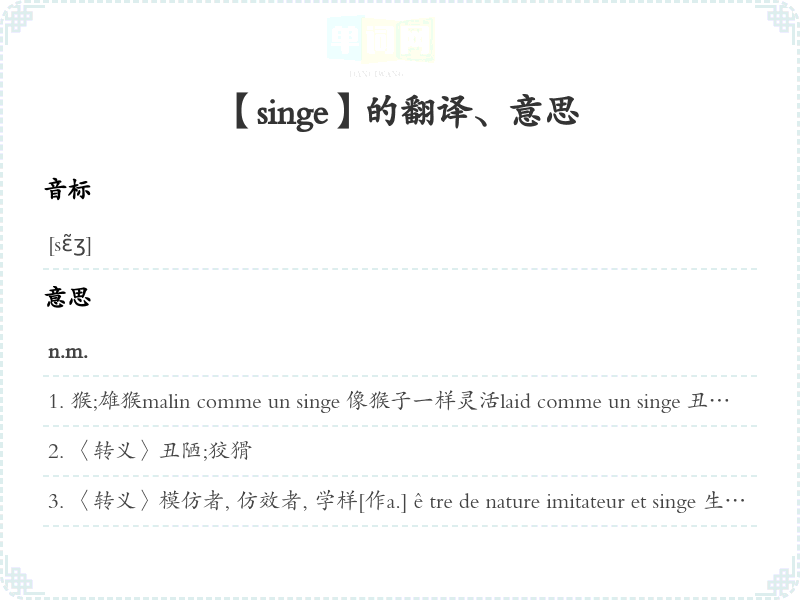 猴;雄猴malin comme un singe 像猴子一样灵活laid comme un singe 丑陋不堪payer en monnaie de singe 〈转义〉空话敷衍债主;空话报答On n'apprend pas à un vieux singe à faire la grimace.〈谚语〉不到教老猴扮鬼脸。 [喻不必多此一举]