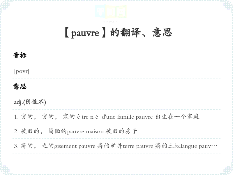 【pauvre】 联想:、 词化:、 副词化:、 近义词:、 反义词: 联想词