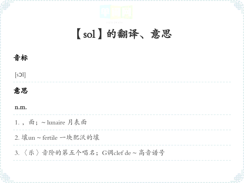 〈乐〉音阶的第五个唱名;G调clef de ~ 高音谱号