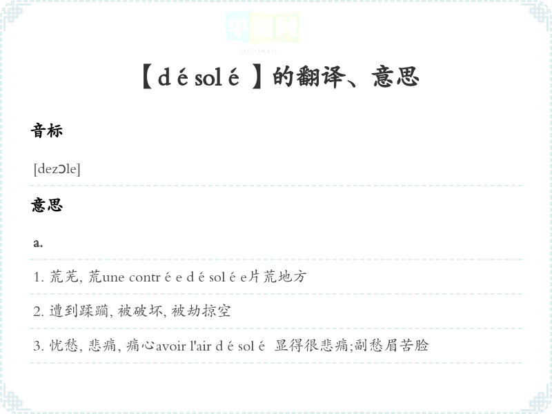 忧愁, 悲痛, 痛心avoir l'air désolé 显得很悲痛;副愁眉苦脸