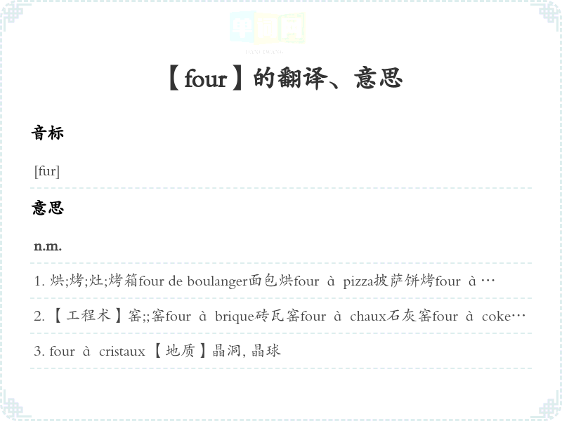 烘;烤;灶;烤箱four de boulanger面包烘four à pizza披萨饼烤four à micro-ondes微波four muni d'un tournebroche有转动铁扦的烤four à gaz煤气灶four électrique电four à pyrolyse自洁式bouche [gueule] d'un four 口, 灶口mettre un gâteau au four 把蛋放入烤ouvrir la bouche comme un four , 〈引申义〉 ouvrir un grand four 张开大口On ne peut être à la fois au four et au moulin.〈谚语〉一个人不能同时做两件事。一个人不能同时在两处地方。faire un four 〈转义〉失, 受挫, 不成功 [多指演出或作品]La représentation a été un four complet [noir].〈引申义〉演出完全失。pièce de four 点petits fours小蛋, 花式点rôti cuit au four 在烘里烤的肉