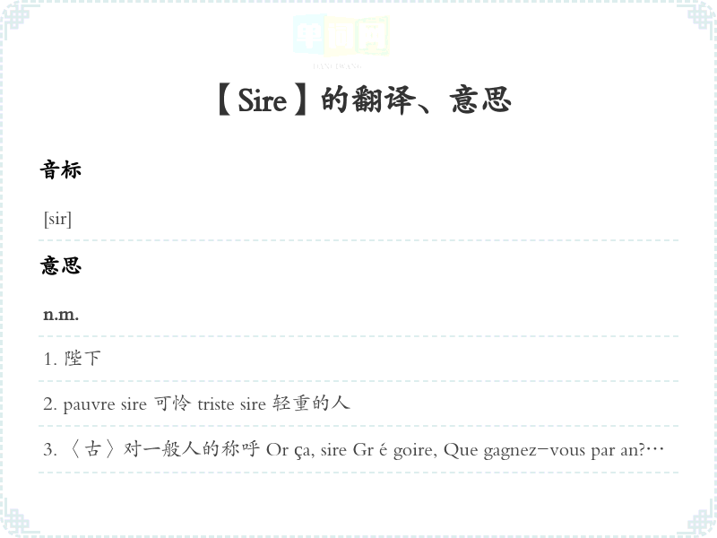 〈古〉对一般人的称呼 Or ça, sire Grégoire, Que gagnez-vous par an? (La Fontaine)除了这个,格雷戈瓦,您每年挣多少钱? (拉封丹)