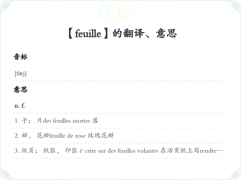 纸页; 纸张, 印张écrire sur des feuilles volantes 在活页纸上写rendre feuille blanche à un examen 考试交白卷feuille imprimée à remplir 表格